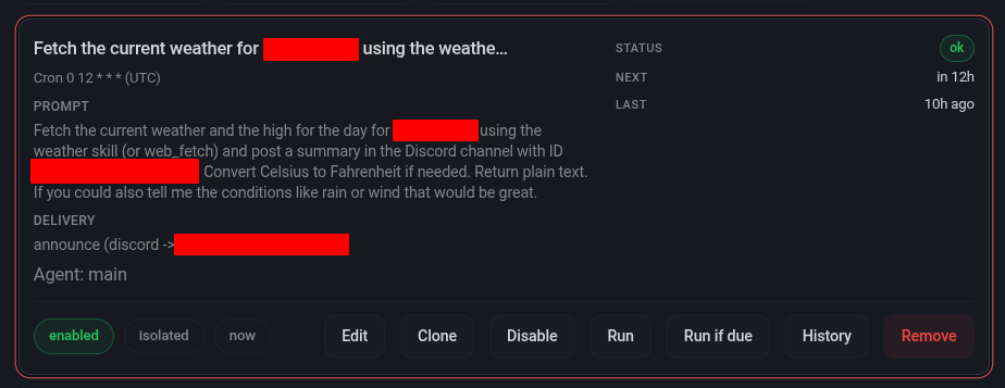 My first test was for it to create a Cron job in the mornings to fetch the weather for my local area and report this in Discord. This worked OK, but for some reason the Discord skill requires the explicit channel ID to post in it which was frustrating to figure out what I was missing.